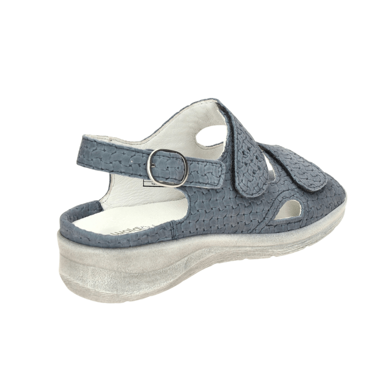 Klassisk blå og sølvfarvet sandal i blødt nubuck læder med to justerbare velcro‑lukninger for nem tilpasning. Sandalen har udtagelig indersål, som gør det muligt at indsætte egne specialindlæg, hvis dette ønskes.