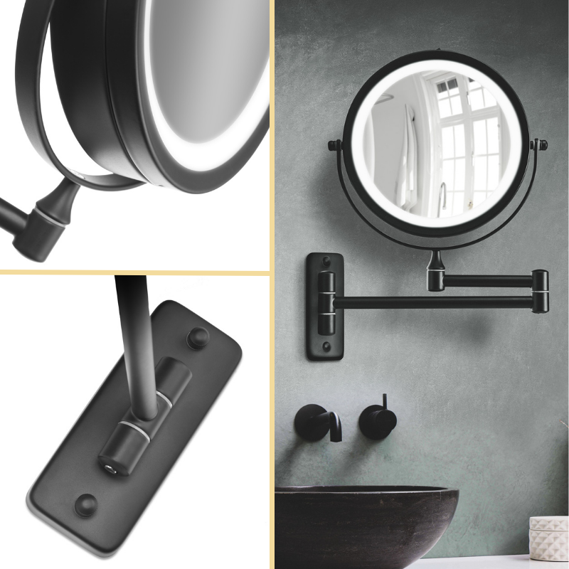 Flot væghængt makeup-spejl i sort med dobbeltsiddet spejl der forstørrer 1x på den ene side og 10x på den anden. Spejlet har indbygget LED-lys med små dioder hele vejen rundt, så du kan se alle detaljer klart og tydeligt.