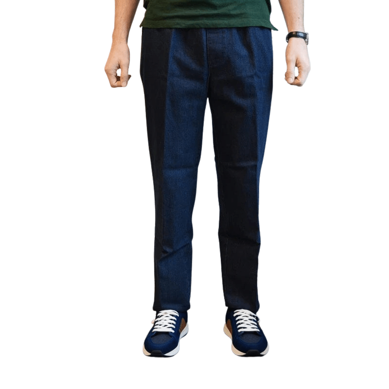 Komfortable denimbukser med ekstra højde i buksedelen og elastik i taljen.