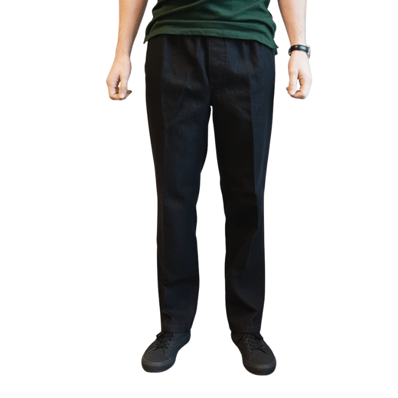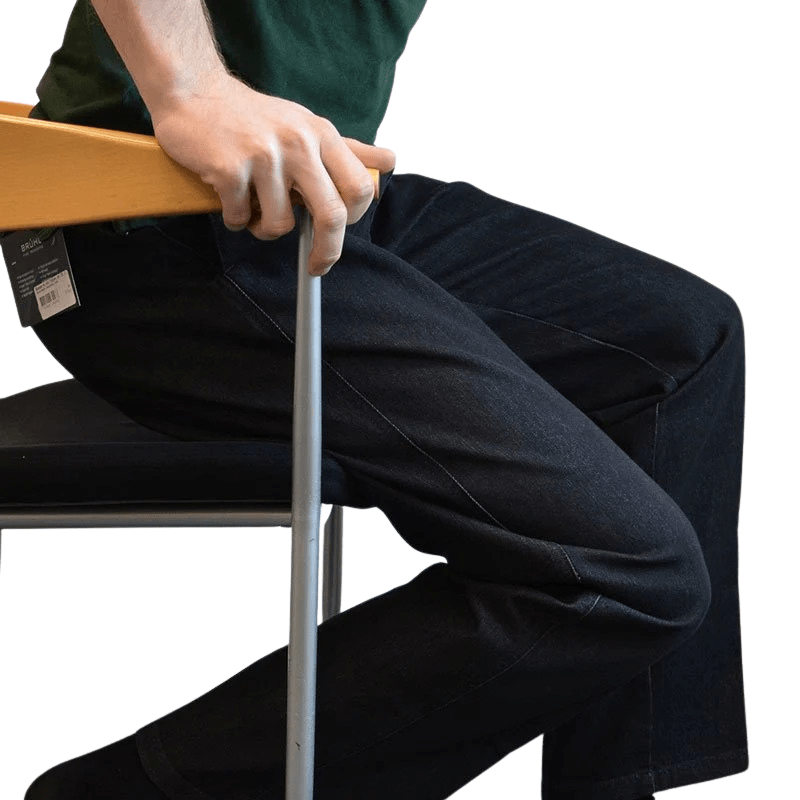 Dejligt komfortable koksgrå/sorte jeans med ekstra højde og elastik i taljen. Disse fleksible cowboybukser er specielt velegnet til kørestolsbrugere og ble-brugere grundet deres gode og rummelige pasform. Kan bæres af både mænd og kvinder.