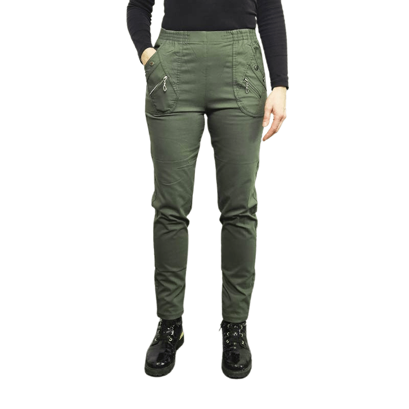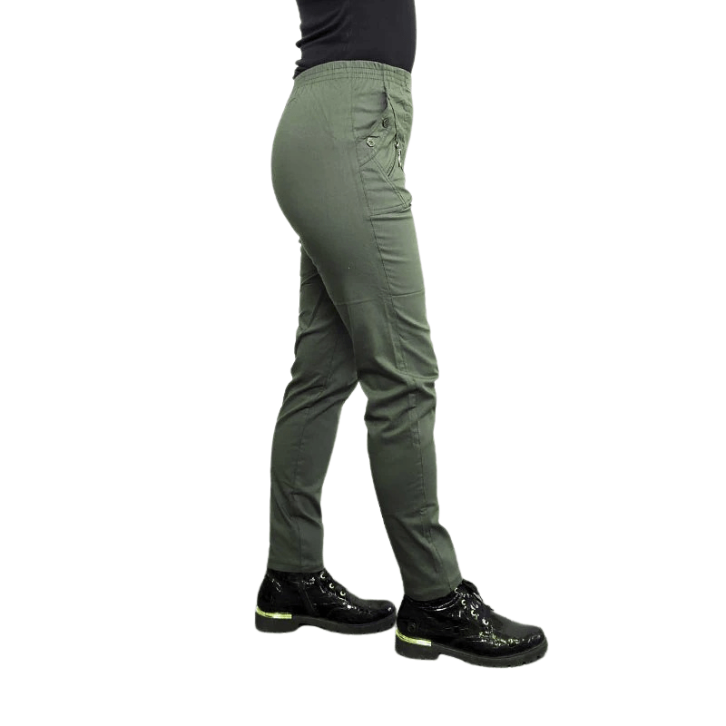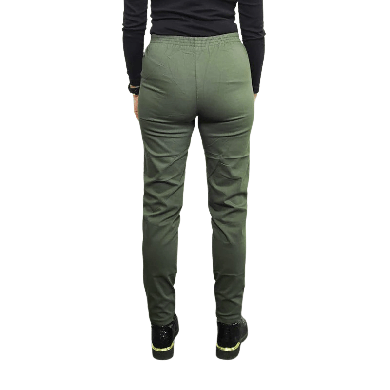 Lækre og behagelige damebukser i en smuk khaki grøn farve med blød børstet inderside og fastsyet elastikkant. Bukserne har høj talje og en god pasform, der passer til de fleste kropstyper.