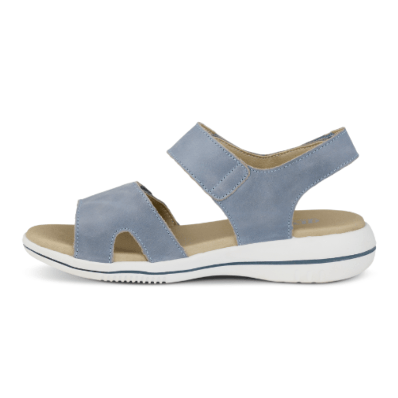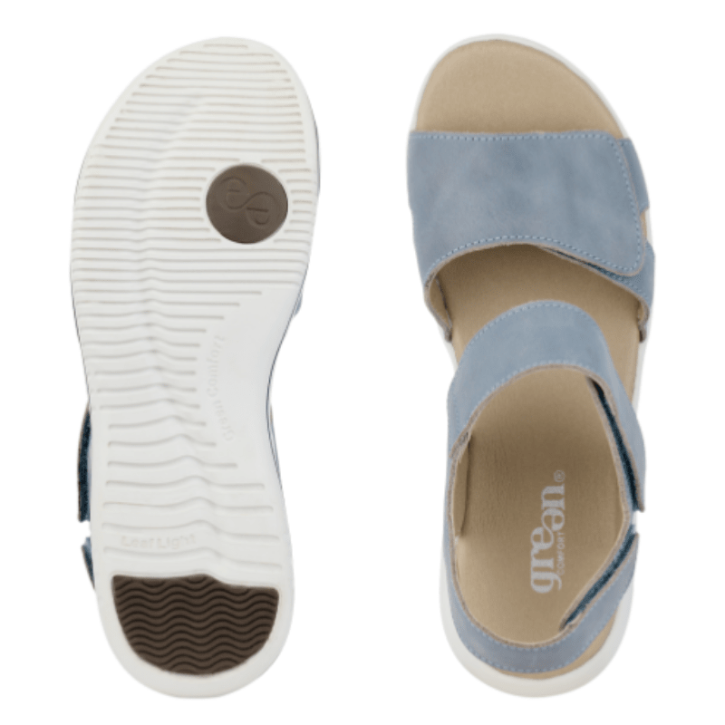 Lyseblå Green Comfort sandal i blødt skind. Sandalen har tre regulerbare velcroremme på vrist og hæl for optimal pasform.