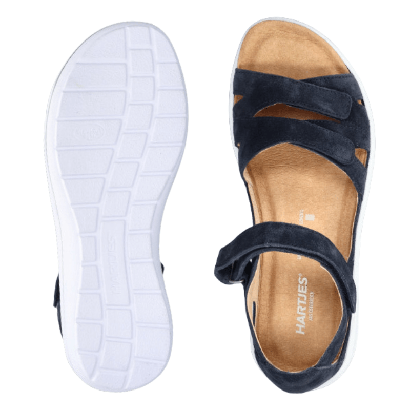 Mørkeblå Hartjes damesandal i blødt ruskind og med tre justerbare velcroremme, som sikrer optimal pasform uden tryk.