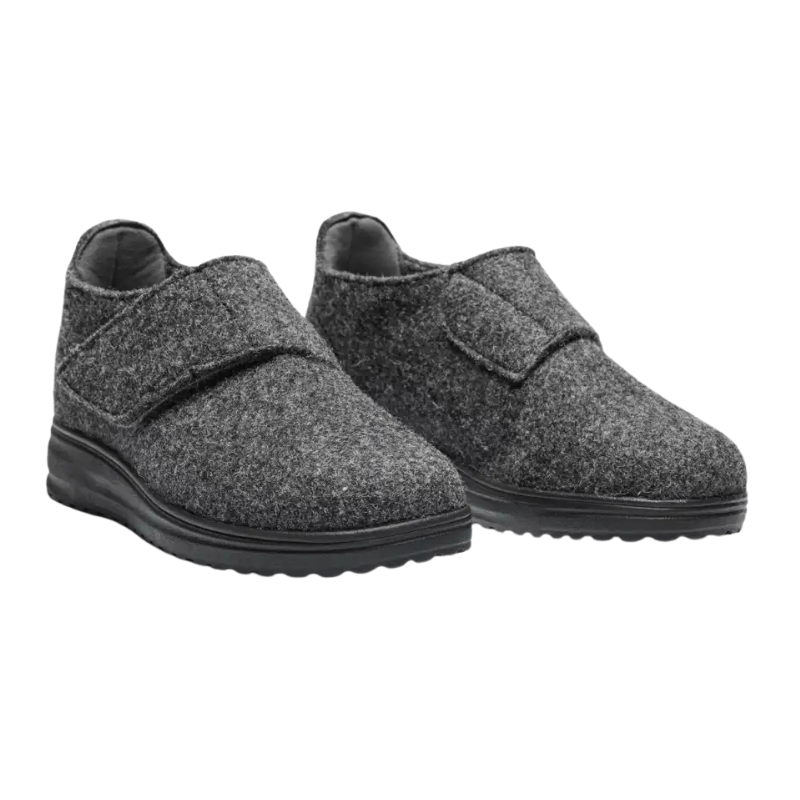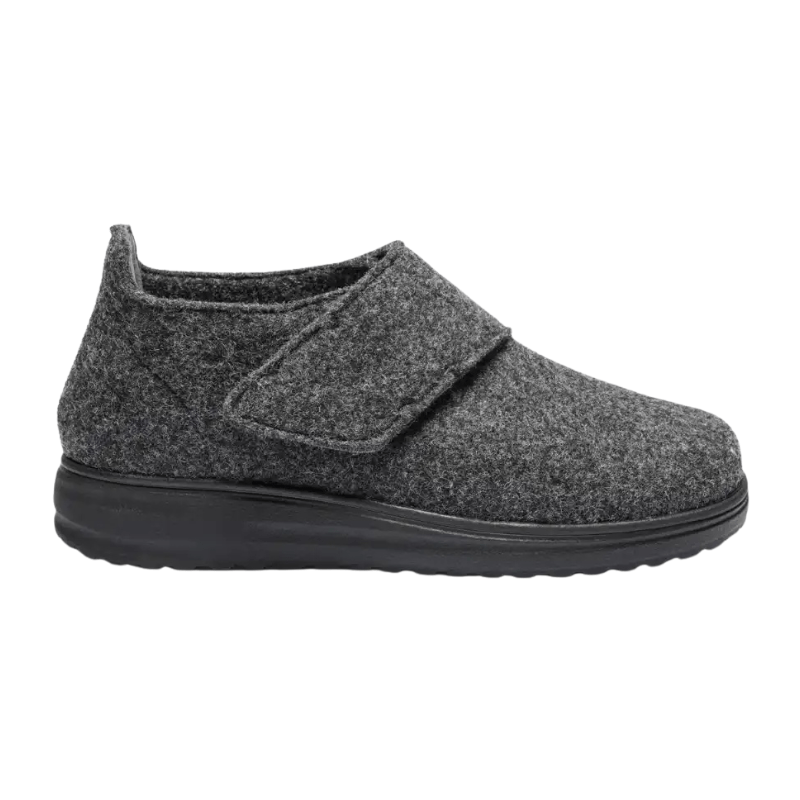 Blød og varm hjemmesko med praktisk hælkappe og justerbar velcrolukning, så pasformen kan tilpasses. Overdelen er lavet i slidstærkt filtmateriale, som giver en behagelig og isolerende følelse.