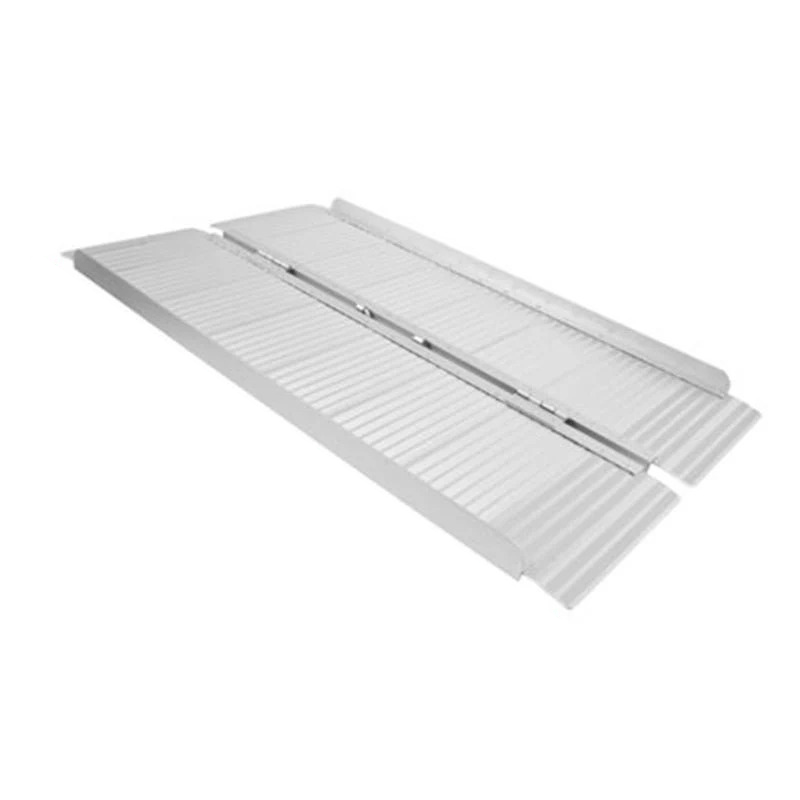 Rampe i aluminium med rillet overflade og bærehåndtag. Rampen er foldbar på langs, så den er nem at flytte og transportere.