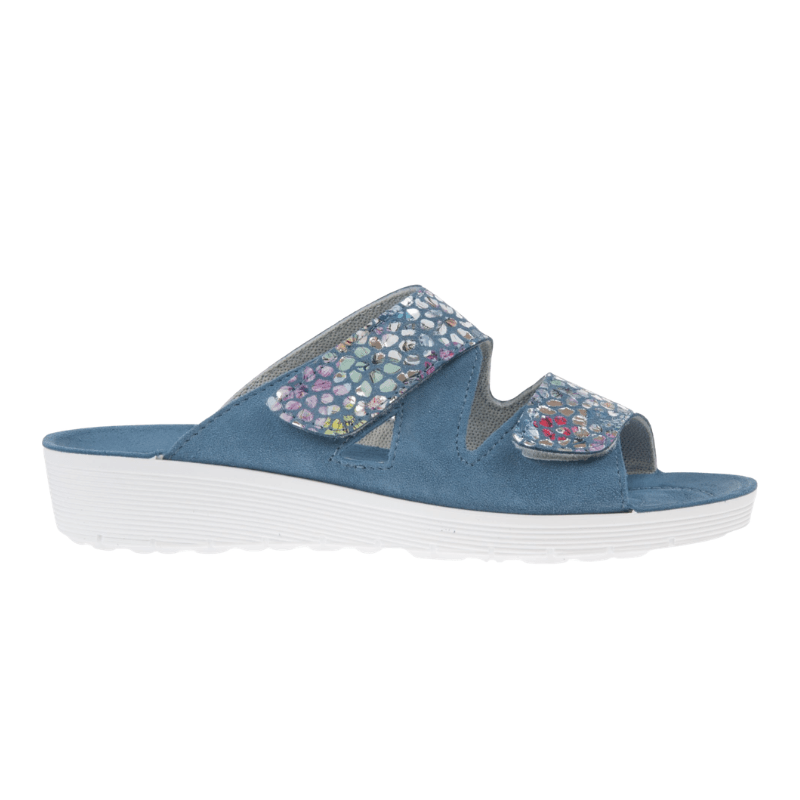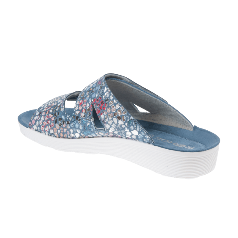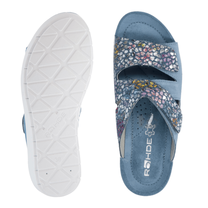 Let slip-in sandal fra Rohde i en jeansblå farve med flotte mosaik-detaljer på remmene.