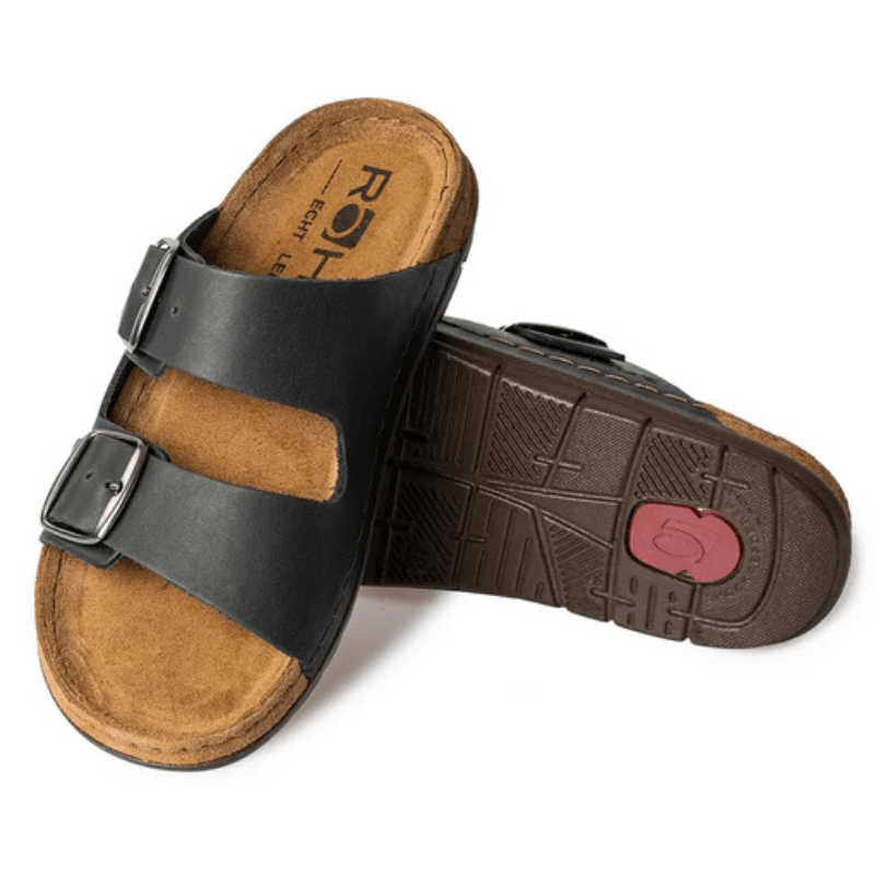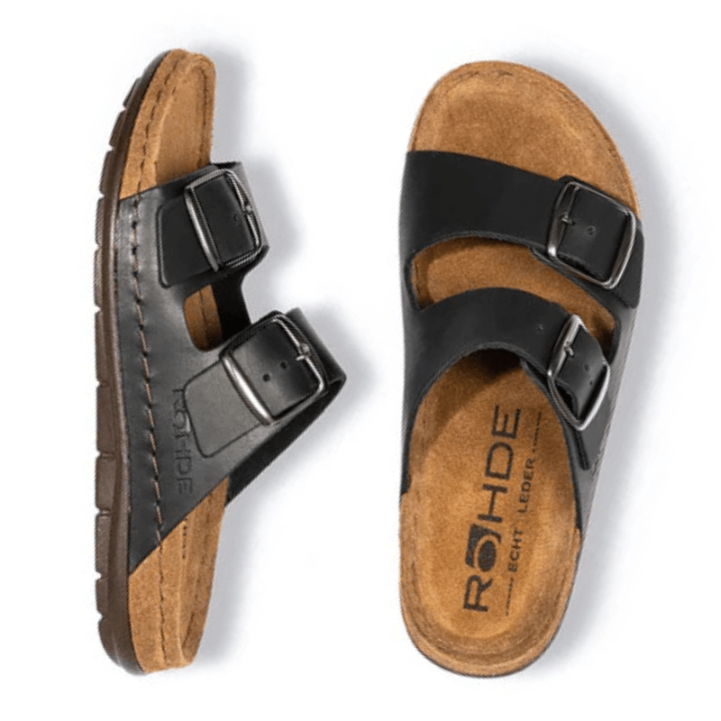 Elegant og tidløs damesandal fra Rohde – perfekt til både hverdag og fritid. Sandalen er lavet i flot sort læder af høj kvalitet og har to justerbare remme, som sikrer en god og individuel pasform.